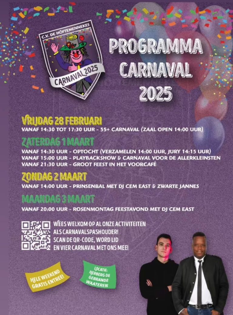 Carnavalsvereniging CV De Höftemennekes heeft het programma voor Carnaval 2025 bekendgemaakt. Van vrijdag 28 februari tot en met maandag 3 maart staan er tal van festiviteiten op de planning in Herberg de Gebrande Waateren.