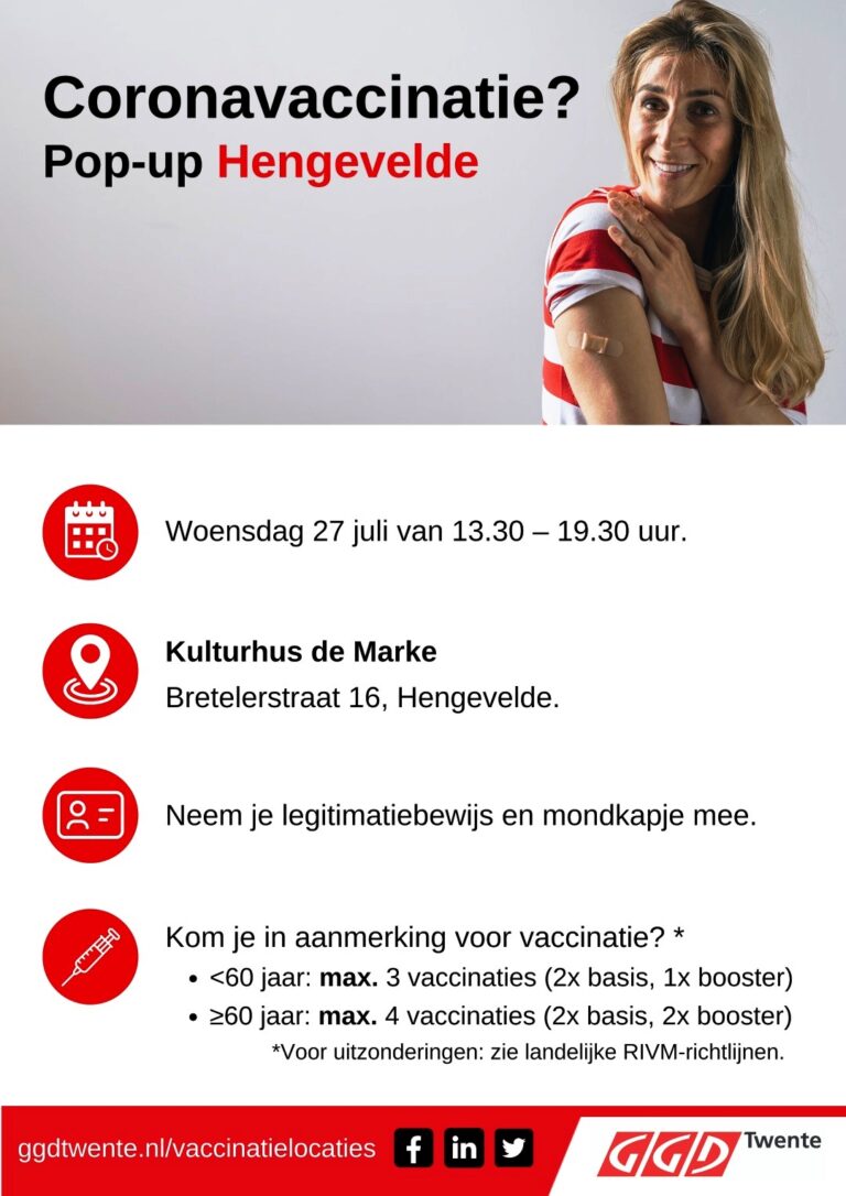 Vanuit de afdeling vaccineren binnen de GGD Twente worden ééndaagse (pop up) COVID-19 vaccinatie acties door heel Twente georganiseerd. Woensdag 27 juli komt de GGD naar Hengevelde! Dit zijn ééndaagse vaccinatielocaties waar burgers hun 1e, 2e, booster- of herhaalvaccinatie kunnen halen zonder hiervoor een afspraak te hoeven maken.