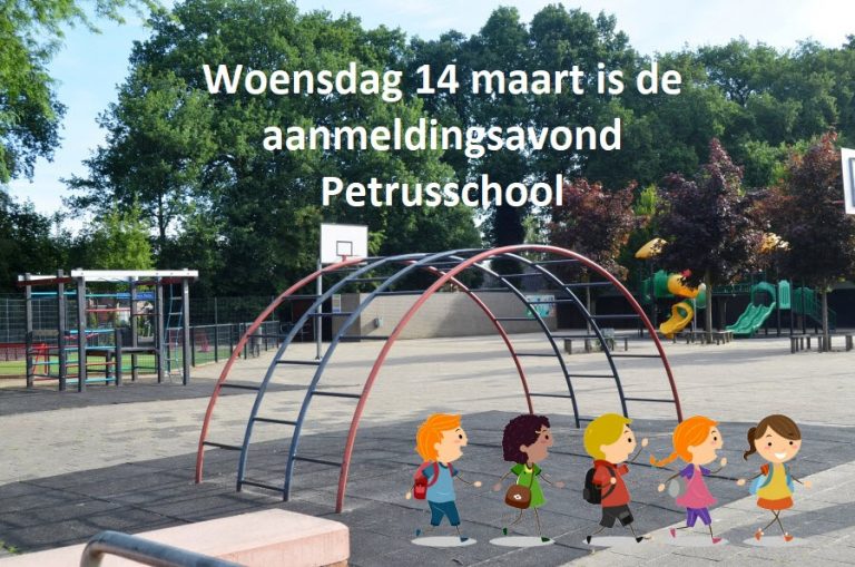 Woensdag 14 maart is de aanmeldingsavond op de Petrusschool. Ouders van kinderen, die voor 1 oktober 2019 vier jaar worden, moeten hun kind nu al opgeven voor het basisonderwijs. Veel van de betreffende ouders hebben hierover al bericht gekregen, omdat hun namen bekend waren via de peuterspeelzaal of het kinderdagverblijf. Uiteraard zijn ook ouders van andere kinderen van harte welkom!