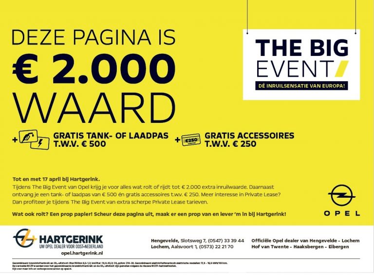 Het is weer tijd voor The Big Event bij Autogarage Hartgerink en dat betekent ongekend veel voordeel, tot 17 april! Want alléén tijdens The Big Event krijg je bij aankoop van een nieuwe Opel tot € 2.000 extra inruilwaarde, een tank-of laadpas t.w.v. € 500, plus € 250 aan accessoires cadeau. Heb je geen auto om in te ruilen? Dat is geen probleem, want tijdens The Big Event krijg je ook tot € 2.000 euro inruilwaarde tegen inlevering van álles wat rolt of rijdt.