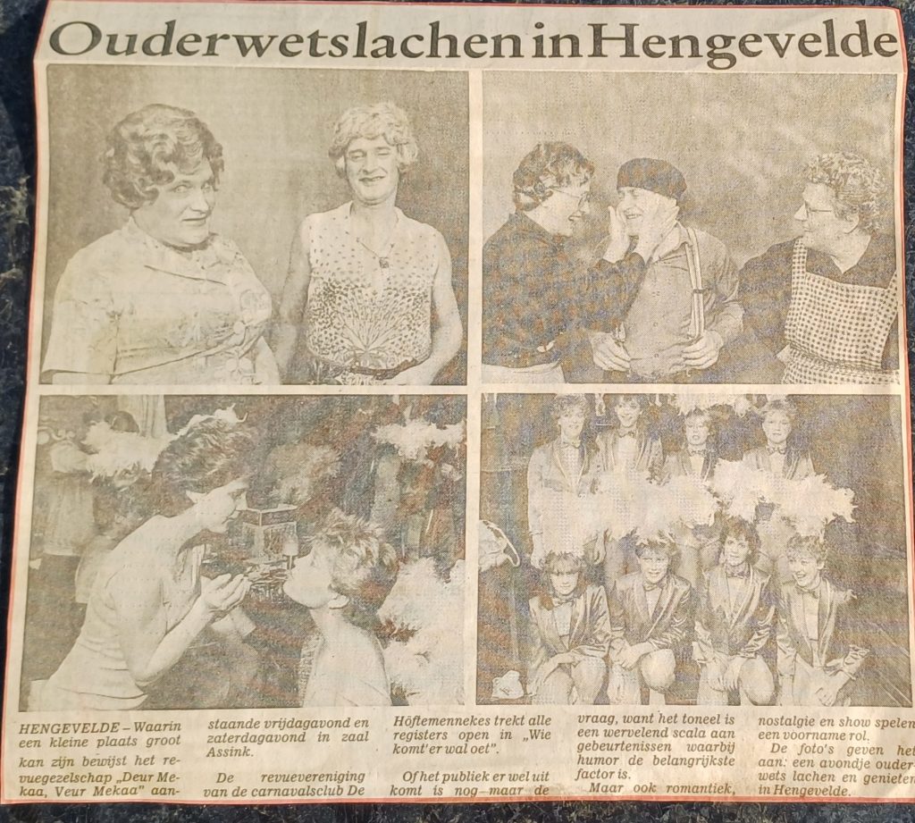 De allereerste revue vond, uiteraard plaats in zaal Assink. “Dat was toen nog een beetje een Wierdense revue in boerenkiel,” blikt Gerda terug. Maar al gauw kreeg het een geheel eigen, Hengevelds karakter.