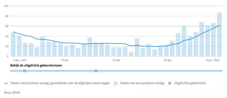 Het aantal positief geteste mensen in Hof van Twente was sinds het begin van de coronapandemie nog nooit eerder zo hoog als afgelopen week. Zo blijkt uit cijfers van het RIVM. Met 87 positief gemelde testen lag dit aantal hoger dan de piek van afgelopen november. Het gemiddelde aantal positief geteste mensen in Hof van Twente over de afgelopen 7 dagen neemt al toe sinds 31 december en deze trend lijkt nog niet te zijn gebroken. Ondanks de toename van het aantal besmettingen vallen het aantal ziekenhuisopnames met 3 in heel 2022 mee. Gisteren werd er in Hof van Twente 1 sterfgeval gemeld als gevolg van corona.