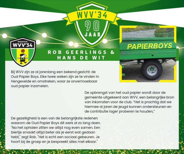 Bij WVV zijn ze al jarenlang een bekend gezicht: de Oud Papier Boys. Elke twee weken zijn ze te vinden in Hengevelde en omstreken, waar ze onvermoeibaar oud papier inzamelen. Het geld dat hiermee wordt opgehaald, gaat rechtstreeks naar de jeugd van WVV. Deze traditie, die sinds 1971 in stand wordt gehouden, zorgt ervoor dat de contributie voor de jeugdleden zo laag mogelijk blijft. Een verhaal van saamhorigheid, hard werken, en vooral: gezelligheid.