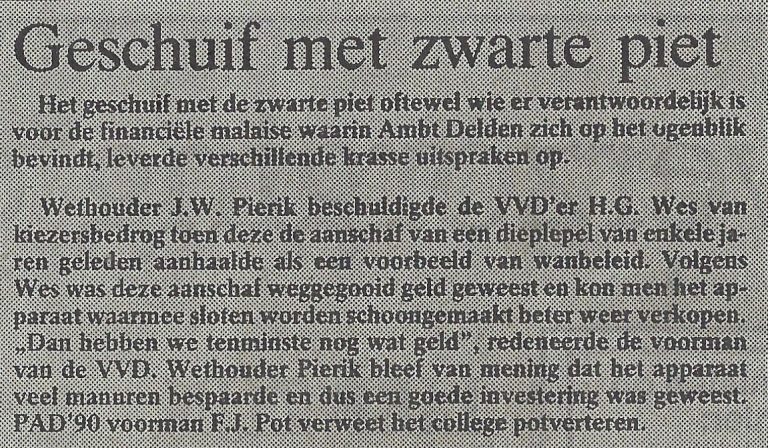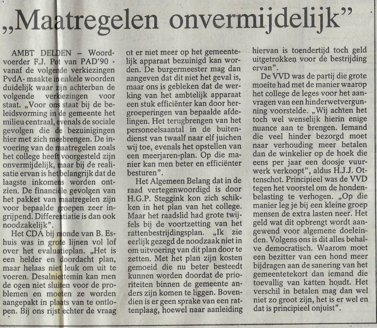 Opvallend was de entree van PAD’90 (Progressief Ambt-Delden). Rob Geerlings en de uit Wiene afkomstige Johan Pierik waren de eersten die namens de nieuwe partij in de Raad kwamen. In de jaren tachtig ontstond de lokale partij met onder andere ook Frans Pot en Jan Pierik, de huidige burgemeester van Borne in de gelederen. Harry Ottenschot werd ook gevraagd, maar koos voor de VVD. ‘Ik ben niet zo links georiënteerd. Het bracht mij juist op het idee om samen met Gerard Franke een afdeling van de VVD op te richten. We waren zo eigenwijs om een brief te schrijven naar de VVD. We kregen als reactie dat er al een afdeling bestond in Ambt-, samen met Stad-. Maar die was alleen in Stad- actief.’