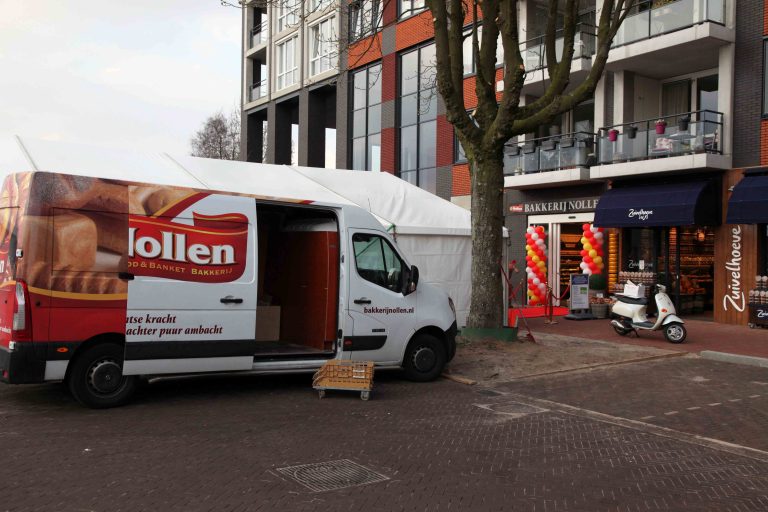 Gisterenavond opende Bakkerij Nollen aan de Wethouder Nijhuisstraat in de wijk Stadsveld te Enschede haar zevende bakkerswinkel. Iedereen, met of zonder uitnodiging, was van harte welkom om voor het eerst een kijkje nemen in de volledig nieuwe bakkerswinkel. Dit alles natuurlijk onder het genot van een hapje en een drankje. Vooral buurtbewoners wisten de weg te vinden naar de bakkerij en spraken hun waardering uit voor de prachtige winkel. De twee zonen van Vincent en Antoinet Nollen, Ties en Wout, knipten het lintje door waarmee de winkel officieel geopend was. Hoogtepunt van de avond was overigens het eerbetoon aan Theo en Minie Nollen, die zichzelf terug zagen achterin de bakkerij, groot afgebeeld aan de wand. Hierop is te zien hoe ze in de jaren 80 aan het werk waren in de bakkerij (foto boven).