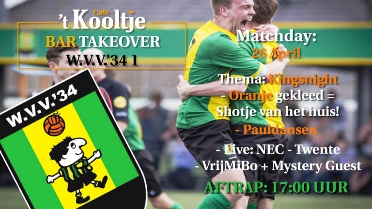 Na een periode van relatieve stilte, is het eindelijk weer zo ver: De Bar TakeOver. Niemand minder dan de heren én dames van W.V.V'34 1 gaan hem organiseren! Het is de dag voor Koningsdag, het thema luidt dan ook: Oranje. Sem Kuipers: ”Daarnaast belooft schitterend weer te worden, daarom openen we de deuren al om 17:00 uur. Een perfecte VrijMiBo (Vrijdag Middag Borrel) tijd! Alhoewel F.C. Twente dan al kampioen kan zijn, is de wedstrijd tegen NEC live op de televisies & op het terras te zien. Ook is er voor de muzikale begeleiding gezorgd. Wie dat is, houden we nog even geheim! Kortom, een middag én avondvullend programma met genoeg belevenissen! Tot vrijdag 26 april!”