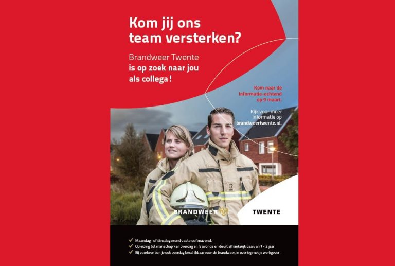Solliciteren kan tot en met maandag 18 maart via www.brandweertwente.nl/werkenbij. Hier staat ook meer informatie over de inhoud van het vak. Op 9 maart organiseert Brandweer Twente een informatiebijeenkomst voor geïnteresseerden. Hier kun je in de praktijk ervaren wat het vak inhoudt en krijg je informatie over de opleiding tot brandweerman- of vrouw.
