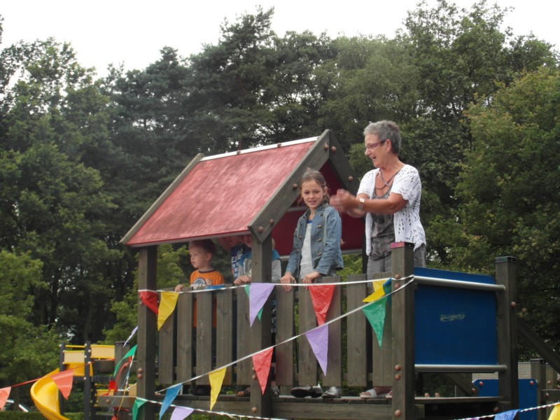 Het geheel was een uitbundige dankbetuiging van alle kinderen voor Christa. Vanaf een klimtoestel kon zij samen met haar kleinkinderen alles goed bekijken. Het was werkelijk een leuk bewegelijk schouwspel. Na het lied kreeg ze van elke groep twee rozen aangeboden. Op deze manier hebben de kinderen afscheid genomen van Christa.