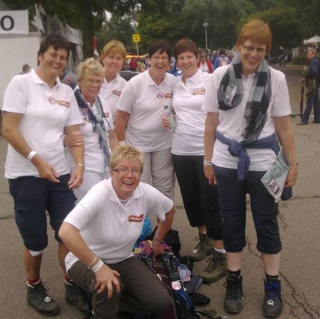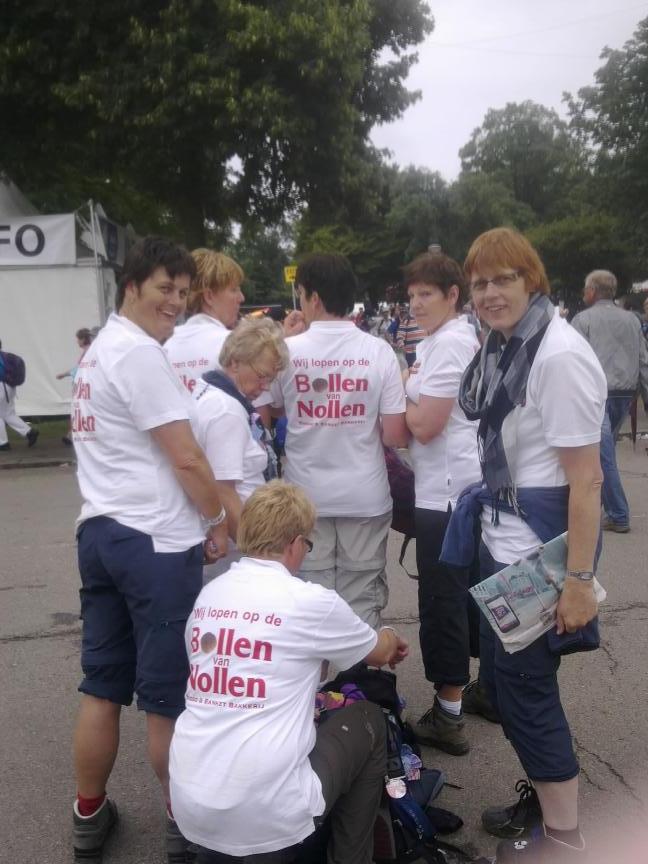 Een groep van zes dames uit Hengevelde en één uit Goor doen samen mee aan de Nijmeegse Vierdaagse. Frieda Stortteler, Gerda Jannink, Gerda Assink, Mathilde Ottenschot, Elly Pierik en Hermien Blokhorst uit Hengevelde en uit Goor Jose Haafkes. Frieda: ”Het is echt super, overal muziekbandjes in de dorpen en steden waar we komen, van alle kanten onderweg hoor je geheime zender muziek. De sfeer is echt prachtig, maar nu zijn we wel een beetje moe,vanmorgen alom 6.15 uur begonnen hoor! Zo meteen laten we ons even lekker los masseren, vervolgens eten en dan op tijd naar bed! We hebben een bed & breakfast op zo’n 10 minuten van de start, die we in oktober al geboekt hebben. Morgen starten we al om 5.15 uur. Tja, erg vroeg, “moar wie slept der mekaar wal deur hen!”