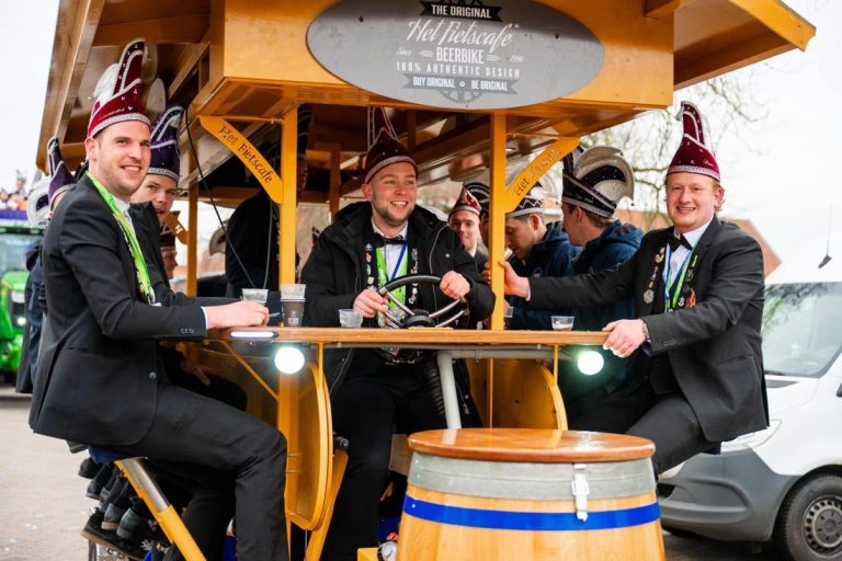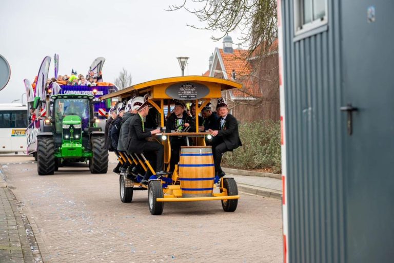 Voorafgaand aan de optocht zorgde de Raad van 11 en de Jojo’s voor een ludiek tintje door per bierfiets richting het gemeentehuis te gaan – een perfecte start van een onvergetelijke dag! 🚲🍻