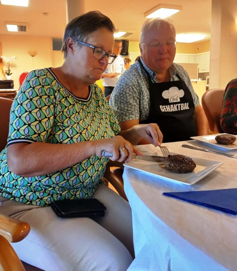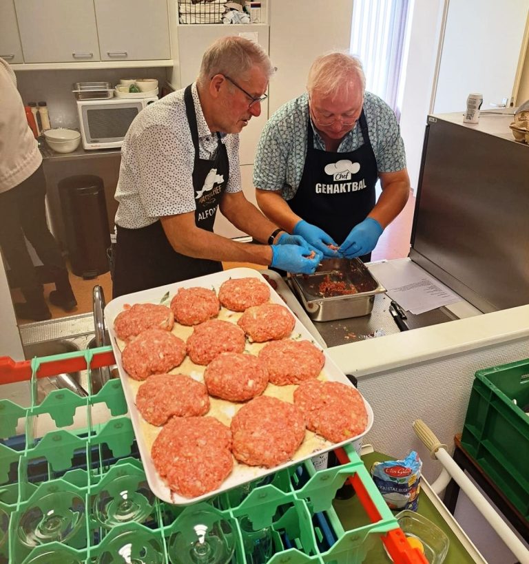 Aan deze ludieke wens geeft het Wensboomcomité graag gehoor. En vroeg Alfons Assink of hij Marcel wou leren gehaktballen maken. Alfons werkt maar wat graag mee, maar wie gaat al die gehaktballen op eten, was de vraag. Tja, dan denk je maar aan één club. Namelijk de dames die elke week eten kookt voor de deelnemers van de Eikenborg. Want hoe leuk is het voor hen dat er ’s een keer voor hun wordt gekookt, beredeneerde het Comité?!