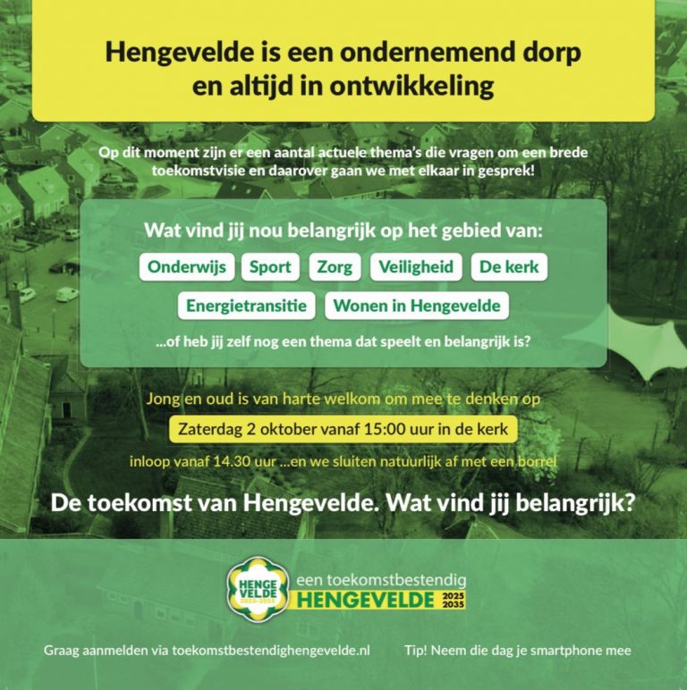 Samen zijn we verantwoordelijk voor de toekomst van Hengevelde. Laten we dus met elkaar in gesprek gaan over hoe we over de verschillende onderwerpen denken. Of het nu gaat om woningbouw, onderwijs, zorg of sport: alles is bespreekbaar. Misschien vind jij het wel interessant om je verder te verdiepen in cultuur, de toekomst van de kerk, duurzaamheid of iets anders. We horen graag wat jij belangrijk vindt.