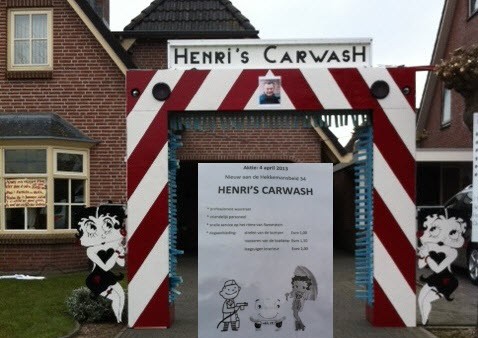 De carwash hierboven op de foto geeft rook, de borstels draaien en er zit zelfs verlichting op. De buurt houdt niet van half werk, net als Henry bij het autowassen!