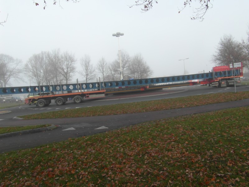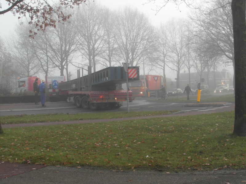 Helemaal uit Den Helder naderde de vrachtwagen de rotonde aan de Goorsestraat, met alle problemen van dien. Door vele keren heen en weer te manoeuvreren slaagde de vrachtwagenchauffeur erin de 32 meter lange stalen balk over het obstakel te vervoeren, ondertussen ontstond aan beide zijden een lange rij wachtende voertuigen.