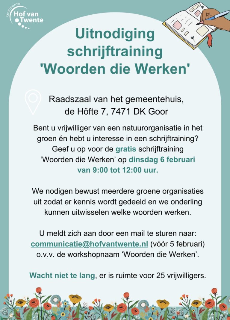Werkt u bij een natuurorganisatie in de gemeente Hof van Twente en hebt u interesse in een schrijftraining? Geef u dan op voor de gratis schrijftraining ‘Woorden die Werken’ op dinsdag 6 februari.