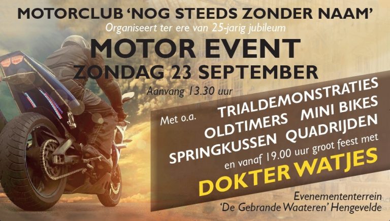 De voorbereiding voor het 25-jarig jubileumfeest van motorclub ‘Nog steeds zonder naam’ is in volle gang. Deze feestdag, op zondag 23 september, zal starten met een jubileumrit. Deze motorrit willen we maken met leden én oud leden. Graag zouden wij dan ook onze oud leden willen informeren over ons jubileum en de jubileumrit. Namen hebben we wel van onze oud leden, maar er missen van vele nog de e-mailadressen. Ken je oud leden attendeer ze dan op deze dag en op dit bericht, zodat zij contact met ons kunnen opnemen. Mocht je geïnteresseerd zijn geworden, én dat ben je, en ook op de hoogte willen zijn van wat er allemaal staat te gebeuren op ons jubileumfeest op 23 september, stuur dan een e-mail naar het onderstaande adres zodat we contact met je kunnen opnemen! [email protected] Tipje van de sluier: ‘Dokter Watjes’ heeft toegezegd de dag af te sluiten!!!