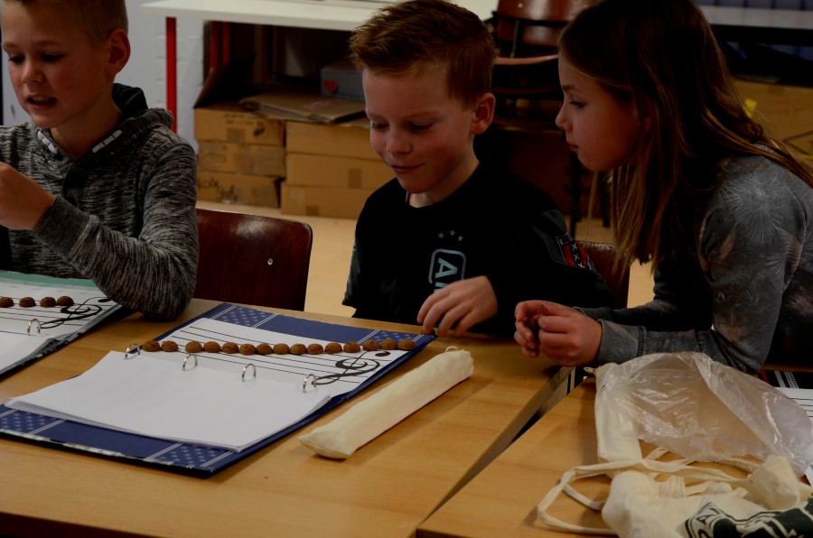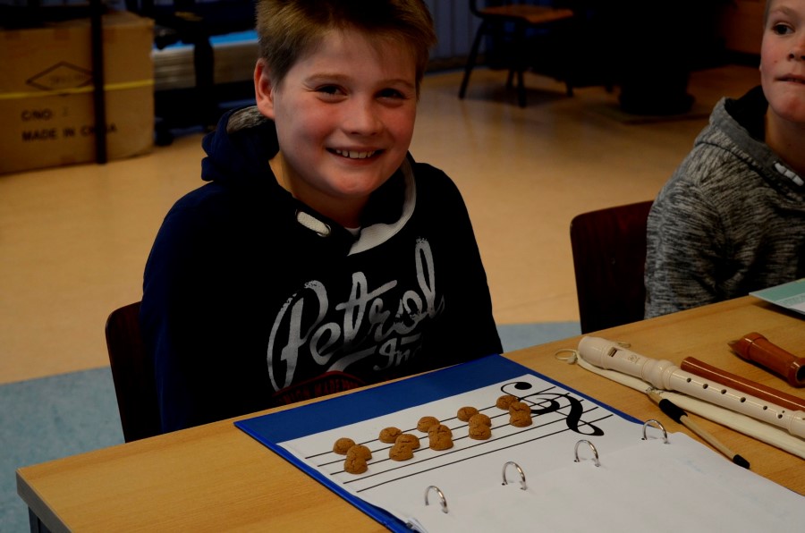 Het is muisstil tijdens de theorieopdracht waarbij de kinderen een ritme mogen schrijven. Daarna krijgen de kinderen een vel met een hele grote notenbalk, en echte noten: pepernoten. Die doen eerst dienst als muzieknoten, daarna mogen de kinderen na elke opdracht een paar pepernoten opeten. Hoe gaaf is dat!