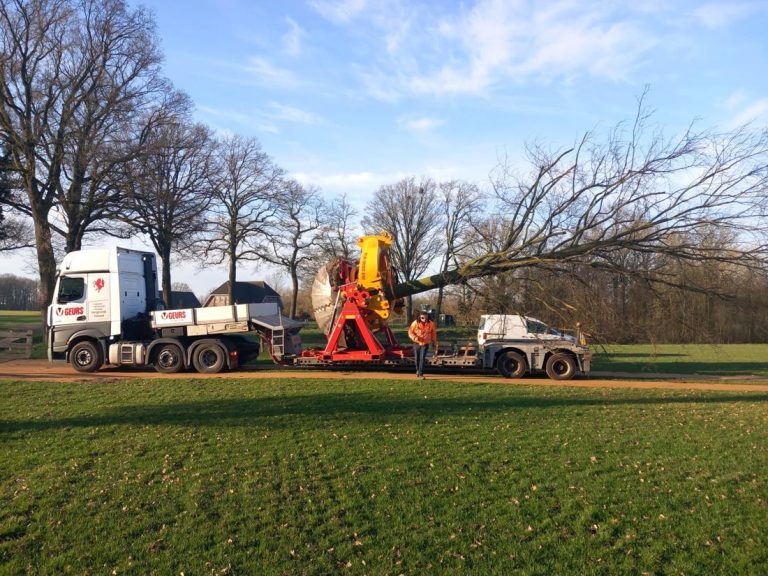 Met een kluit van maar liefst 300 centimeter in doorsnee vereiste de klus zwaar materieel en nauwkeurige coördinatie. De boom werd zorgvuldig uitgegraven, op een vrachtwagen gelegd en in horizontale positie vervoerd om schade tijdens het transport te voorkomen.
