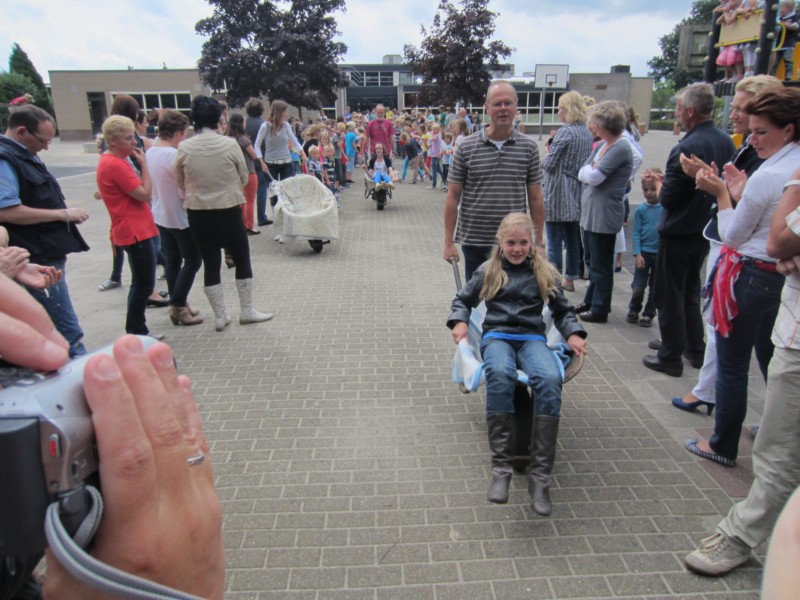 Als oud vuil per kruiwagen afgevoerd? Nee hoor! Op inmiddels traditionele, maar tevens ludieke wijze worden de op handen gedragen leerlingen wederom per kruiwagen de school uitgedragen. Na eerst gezamenlijk te hebben gebowld bij de Gebrande Waateren werden de kinderen rond 11.30 helemaal klaar geacht voor het vervolgonderwijs en hebben als eersten van de Petrusschool vakantie tot drie september. De overige leerlingen moeten nog tot vrijdag 12.00 uur geduld hebben om van de welverdiende vrijheid te genieten.