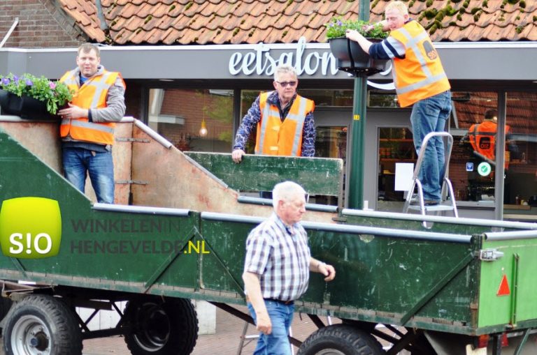 Woensdagochtend was het zo ver: Vanaf 10.00 uur waren Henk Pierik, Joan Peerik, Bennie Blanken, Peter Workel en Jon Klein Breteler druk in de weer met het plaatsen van de vele de buitenbakken aan de Goorse- en Diepenheimsestraat en op het kerk- en marktplein. Met auto en aanhanger eerst de nieuwe buitenbakken aan de palen schroeven en na de middag met de WVV trekker en de papierwagen werd overgegaan tot het plaatsen van de binnenbakken met planten. Hierbij waren dezelfde heren weer aanwezig maar dan aangevuld met Henk Pierik, Hans Mulder alias de Bloemruiker en Nico Bebseler. Jon:”Tot op heden hebben we de papierwagen voor het water geven gebruikt, maar vanaf volgende week hebben we een eigen wagen voor het wekelijks water geven. Deze wagen wordt gebouwd door Jos Goselink en Bennie Blanken en die wordt mede mogelijk gemaakt door Doeschot Constructie, Lentelink Schilders, Loonbedrijf Pelle, Keuper en Timmerbedrijf Edo Pelle. Dit hele gebeuren is een initiatief van SIO winkeliers en ondersteund door de Hengevelde ondernemersvereniging SIO in samenwerking met voetbalvereniging WVV’34.