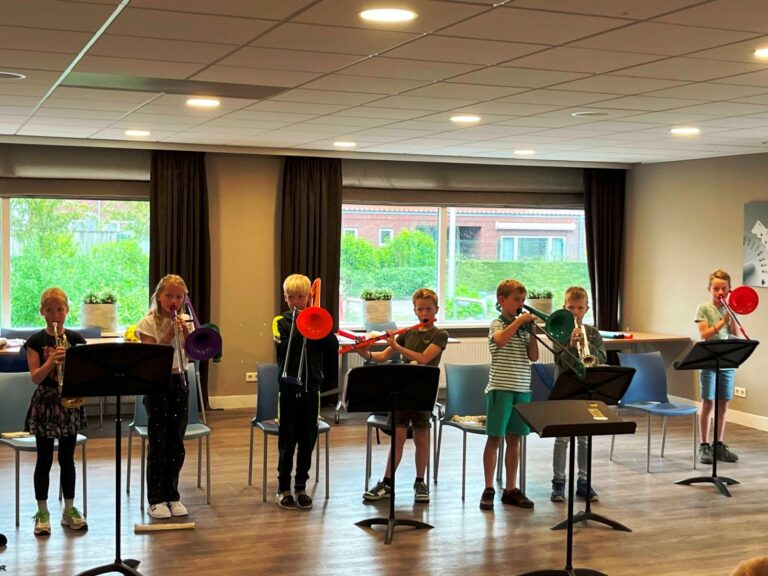 Afgelopen week hebben 7 leerlingen een spetterend optreden gegeven als afsluiting van hun Kunst=Tof leertraject. Onder enthousiaste leiding van muziekdocent Ria Degenkamp hebben ze in de Marke een groot publiek vermaakt met allerlei instrumenten. De blokfluit, trompet, trombone, dwarsfluit, diverse percussie en zang is hierbij langsgekomen. De aanwezige ouders, opa’s, oma’s, broertjes en zusjes waren onder de indruk. En stiekem waren er een aantal ook wel een beetje jaloers omdat ze zelf ook wel graag een instrument zouden willen kunnen spelen.
