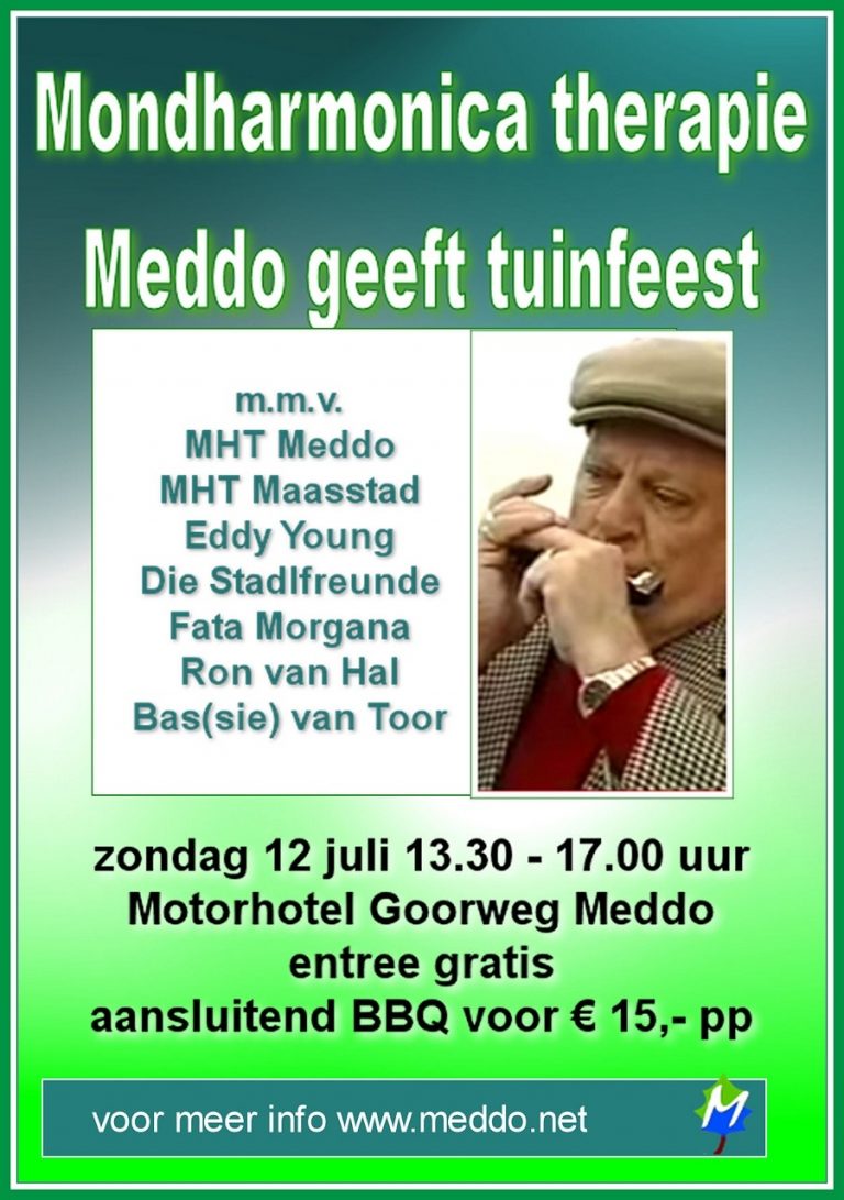 Bovengenoemde muzikanten verlenen aan het tuinfeest van MHT Meddo hun gratis medewerking.