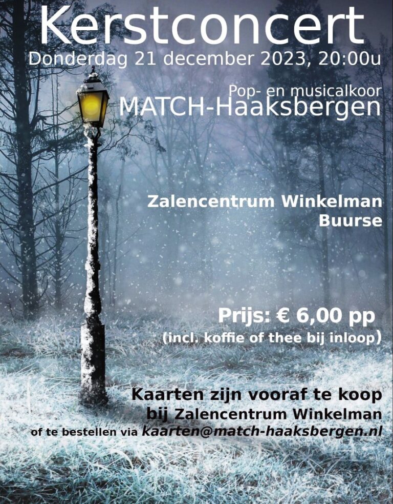 Kaarten kunnen besteld worden door 6 euro per kaartje over te maken op de rekening van MATCH-Haaksbergen: NL74 RABO 0145 9240 68, onder vermelding van ‘kaartjes kerstconcert’ en een mailtje met uw adres te sturen naar [email protected] – dan worden de kaarten thuis afgeleverd.
