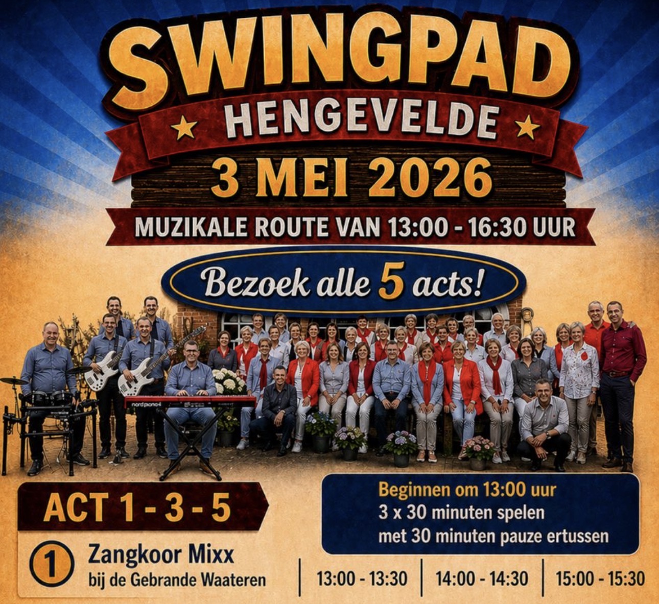 Muzikale route van 13:00 – 16:30 uur, het koor MiXX: 3 mei Gebrande Waateren