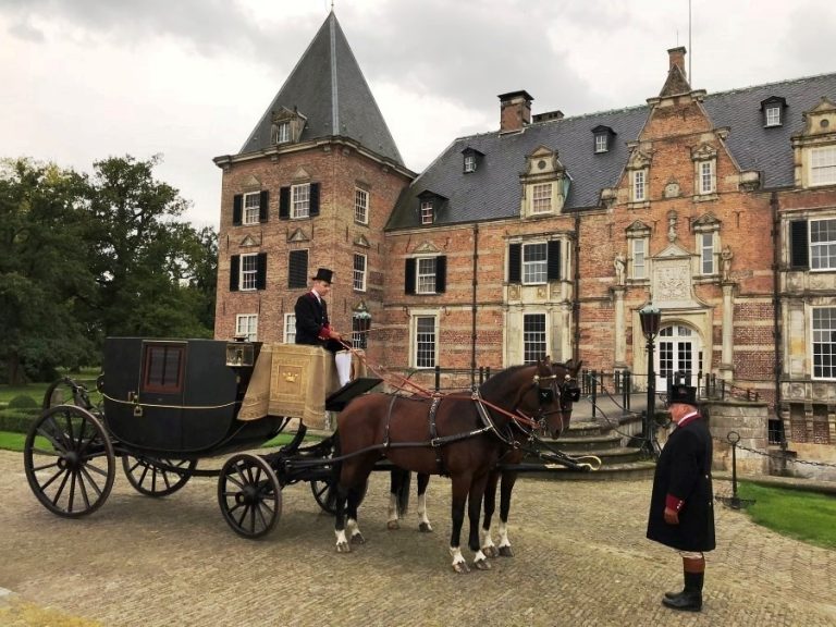 Komende zaterdag 3 november zijn de stallen en het archief van Twickel open. Daar zijn enkele van de 49 pronkstukken te zien. In het Bouwhuis aan de rechterkant (het archief): de aankoopakte van Twickel, oude kaarten en geschriften. In het Bouwhuis aan de linkerkant (de stallen): onder andere de zo prachtig gerestaureerde Staatsieberline.