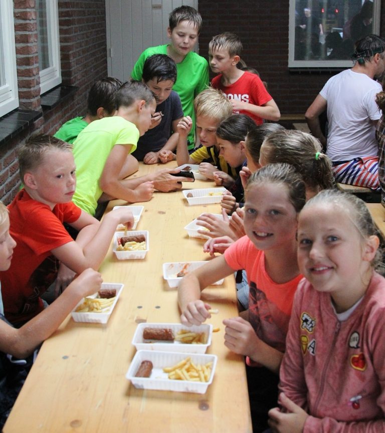 De tweede dag van Houtdorp begon met donkere wolken aan de lucht. (KLIK HIER VOOR DE FOTO'S) Na een paar kleine buien kwam de regen met bakken uit de lucht. Verschillende groepen gingen schuilen onder de overkapping van Varenbrink, de carport van Koebrugge en in de mooie loods van de zomerfeesten. Natuurlijk waren er ook groepen die zich door de regen niet lieten tegenhouden en gewoon door bleven timmeren. Ze kwamen alleen even schuilen om ranja te drinken en de lekkere kaas en worst van slagerij Brummelhuis te nuttigen. Gelukkig konden de kinderen door de flexibiliteit van eetsalon Leo's al om 11.30 uur aan de patat en de frikandel, zodat ze na het eten konden genieten in het zonnetje en weer konden beginnen met bouwen. Het werd zelfs nog zo warm dat we wel afkoeling konden gebruiken en verrast werden door Gerard Workel die heerlijke vanille-ijsjes mee bracht voor alle kinderen en begeleiders.