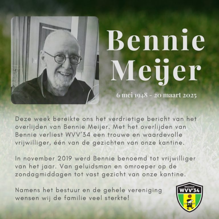 Deze week bereikte ons het verdrietige bericht van het overlijden van Bennie Meijer. Met het overlijden van Bennie verliest WVV’34 een trouwe en waardevolle vrijwilliger, één van de gezichten van onze kantine.