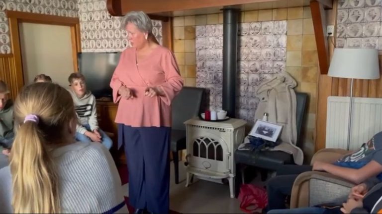 Op boerderij Ten Heggeler vertelde Margot over de inval van de Duitsers ruim 80 jaar geleden. In de oorspronkelijke woonkamer, waar dit zich destijds afspeelde, hoorden de kinderen hoe de Duitsers binnenvielen om twee Poolse piloten op te pakken. Drie broers Ten Heggeler werden meegenomen en opgesloten.