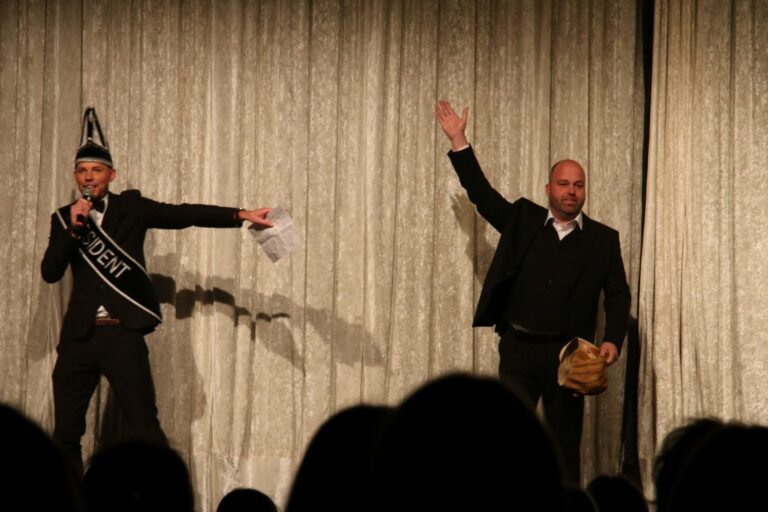 Tijdens de slotscène van ‘De jongens van de bouw’ waar zowel collega’s van Raanhuis en Ten Heggeler menigeen door de mangel haalden was het ineens een persoon met het masker van de Koning die het podium betrad.