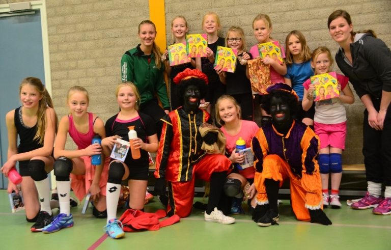 Het leek een training net als alle anderen, totdat er twee pieten uit de kleedkamer kwamen. Er was ineens hilariteit onder de meiden van de Cole Moves Volleybal. De pieten zeiden dat ze al heel veel konden, maar volleyballen, dat moesten ze nog leren. De vraag van de Pieten was dan ook, of deze meiden ze daarmee konden helpen . Hier werd natuurlijk geen nee opgezegd, dus aan de bak. Eerst een estafette, om warm te worden, dit ging de pieten goed af. Daarna het echte werk, nadat de jongste jeugd dit had voor gedaan dachten de pieten het ook wel te kunnen. Nou ze hadden goed opgelet en na een beetje oefenen konden de pieten al best een beetje volleyballen. Dus nog een partijtje spelen, de pieten tegen de meiden, natuurlijk wonnen de volleyballers dit! Ook hadden de pieten nog cadeautjes van Sinterklaas meegekregen, natuurlijk moest er eerst gezongen worden voordat de cadeaus uitgedeeld konden gaan worden. Super gedaan meiden en Sinterklaas en natuurlijk Pieten bedankt voor deze leuke training!