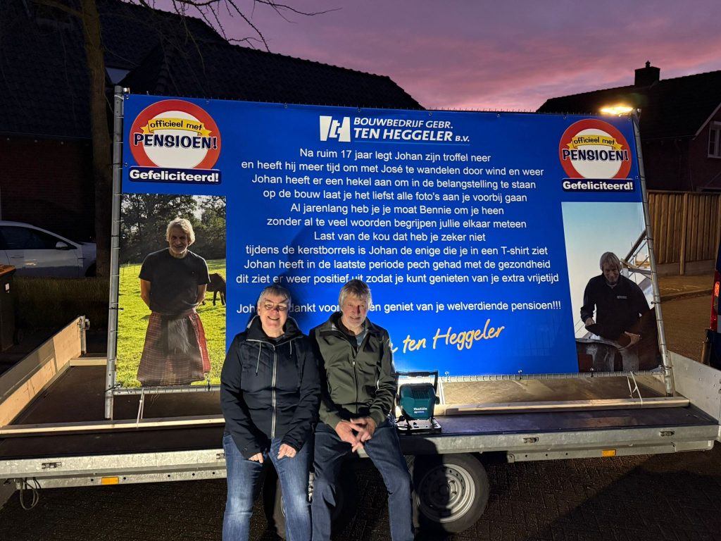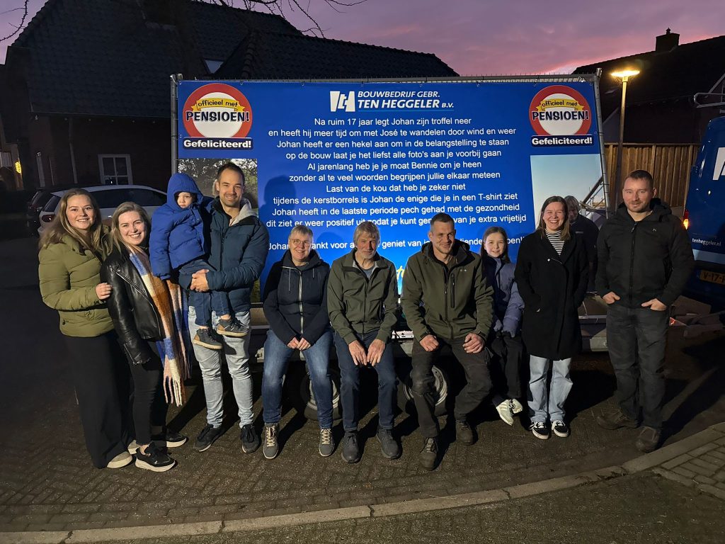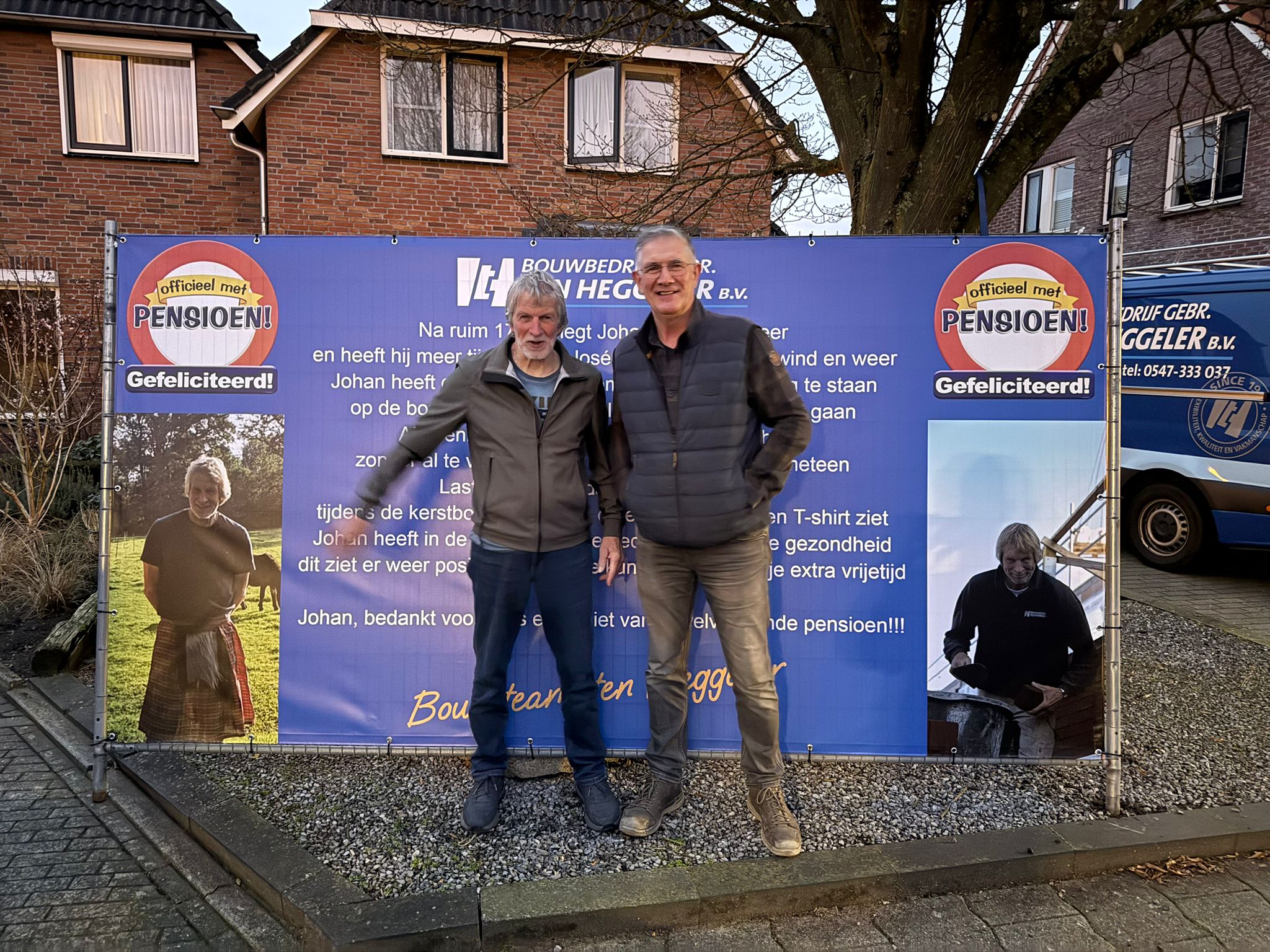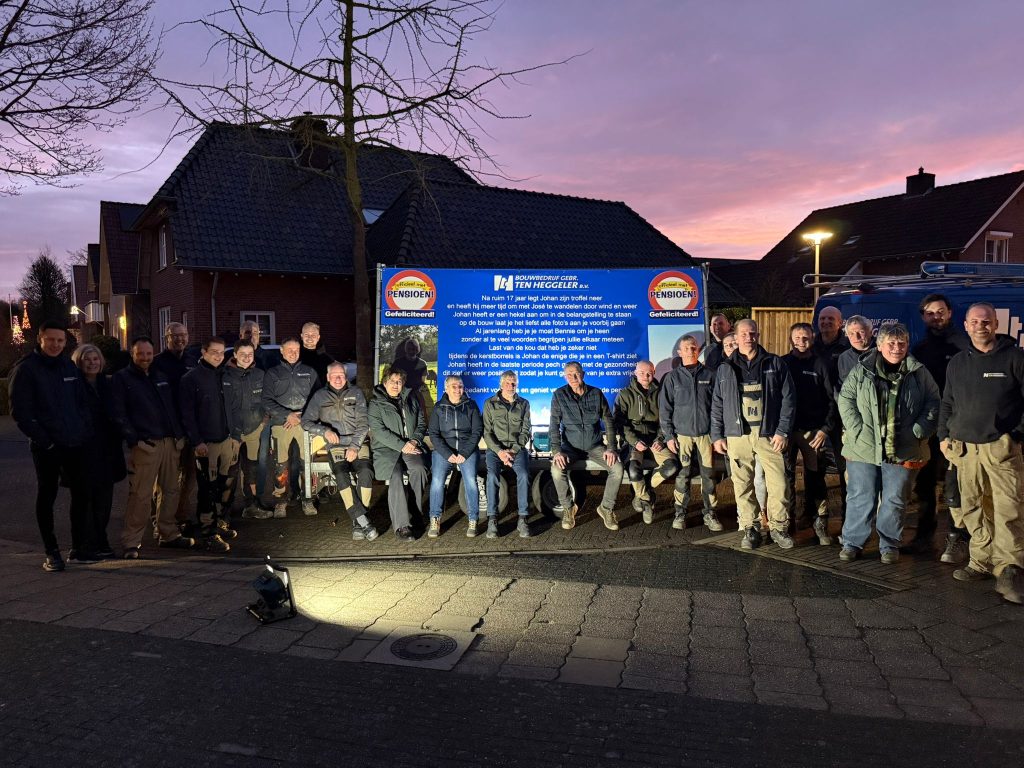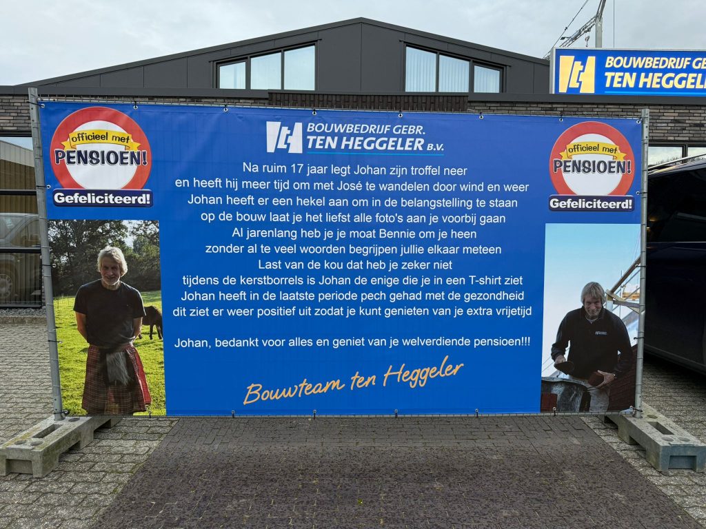 Vandaag is de laatste werkdag van onze collega Johan Lansink. We zijn vanochtend in alle vroegte in colonne met al onze collega’s naar zijn huis gereden en hebben hem verrast met een mooi doek in zijn voortuin. Vrijdagmiddag gaan we dit goed vieren met alle collega’s en zijn familie.