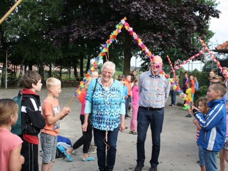 Juf Dini Bloemen heeft donderdag 14 juli met een groots feest afscheid genomen als groepsleerkracht van obs Markvelde. Zij gaat na 34 jaar in het onderwijs te hebben gewerkt in onder meer Rekken, Markelo en de laatste 6 jaar in Markvelde, samen met haar man genieten van de haar gegunde vrije tijd. Om half 8 zaten het team en juf Dini met haar man al aan het feestelijke ontbijt. Daarna was er een heel gezellig samenzijn met de kinderen van school, waarbij alle groepen een aantal mooie verrassingen hadden voor juf Dini in de vorm van liedjes, gedichten, zelfgemaakt cadeaus en natuurlijk bloemen als dank voor haar inzet. Bloemen waren ook de blikvanger in de bloembakken van de tuinbank die juf Dini Bloemen kreeg als gezamenlijk cadeau van school. Hierna ging iedereen mee naar Erve Brooks, waar de kinderen zich kostelijk konden vermaken. Na afloop was er een lekkere smulpartij en mochten de kinderen een cadeautje uitzoeken.