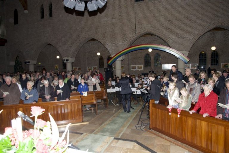 Een mooi programma dus dat ook nog eens werd ondersteund door de grootse licht- en videobeelden die op de lange muur boven het altaar werden geprojecteerd door twee enorme beamers. Een soortgelijke presentatie biedt perspectief voor de toekomst. Met dank aan Rob en Bas Kuipers.