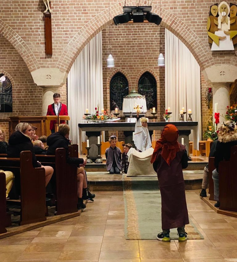 Vooral voor groep 3 was het speciaal, zij mochten in een voorstelling het kerstverhaal uitbeelden. De andere klassen van de Petrusschool gingen in colonne langs de verlichte route van de school richting de kerk. Ook werden er diverse liederen gezongen vanuit de goed gevulde kerkbanken.