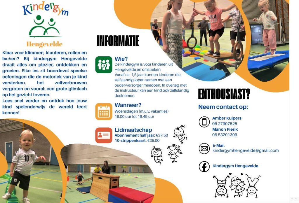 Klaar voor klimmen, klauteren, rollen en lachen? Bij kinder gym Hengevelde draait alles om plezier, ontdekken en groeien. Elke les zit boordevol speelse oefeningen die de motoriek van je kind versterken, het zelfvertrouwen vergroten en vooral: een grote glimlach op het gezicht toveren.Lees snel verder op de flyer en ontdek hoe jouw kind spelenderwijs de wereld leert kennen!