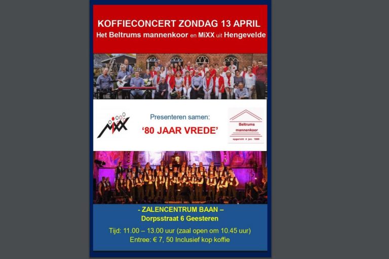 Maar hoe goed je ook bent en hoe fijn de sfeer op de repetities ook mag zijn, het is nodig om zichtbaar te zijn. Zichtbaar natuurlijk in Hengevelde maar ook daarbuiten. Nieuwe bewoners van Hengevelde ontvangen bijvoorbeeld een welkomstpakket. Hier mag informatie over MiXX natuurlijk niet ontbreken. Maar ook daarbuiten is goede zichtbaarheid van groot belang. Daarop zal door het bestuur geïnvesteerd worden. Banners zijn er al en flyers etc zijn in de maak. Gedacht wordt ook aan een leuke meeting met dorpsgenoten en lokale optredens. Maar ook goede posters zoals de aankondiging van het gezamenlijk met het Beltrums mannenkoor geplande ’80 jaar vrede’ koffieconcert op 13 april aanstaande.