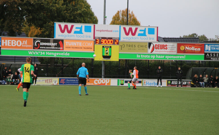 WVV’34 heeft zichzelf vandaag een goede dienst bewezen in de strijd om de bovenste plekken. Het won met 3-2 van Lemelerveld, nadat het bij rust nog tegen een totaal onnodige 2-1 nederlaag aankeek. Onnodig, aangezien de Hengeveldenaren zeer goed uit de startblokken kwamen. De gasten werden vanaf het begin onder druk gezet en diverse kansen volgden voor onder meer Mahmoud Jaafil en Lars Aarnink. Het euvel wat al vaker kwam bovendrijven in de laatste wedstrijden was ook vandaag weer een puntje van aandacht, scoren. Dit gebeurde dan toch na een kwartier spelen. Lars Aarnink kon na een goede actie de 1-0 eenvoudig binnenwerken. Kat in het bakkie, zo leek het. Echter gebeurde vlak daarna tot tweemaal toe hetzelfde, simpel verdedigen en alerte spitsen zorgden voor de 1-1 en 1-2.