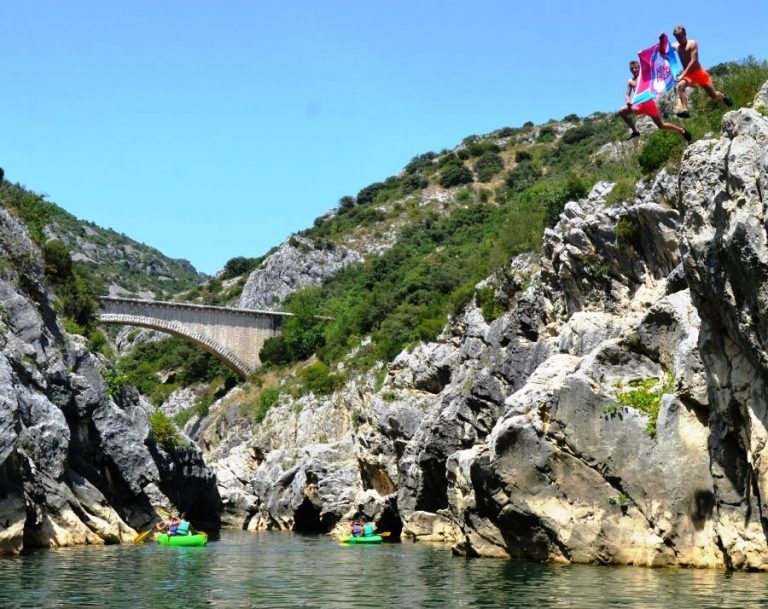 De Hengeveldse vlag reikt tot ver over de landsgrenzen, deze keer is hij met de familie Wegdam opgedoken in Zuid Frankrijk: De Wegdamboys, Stan en Mart zochten het hogerop en waagden de sprong in het diepe, met de Hengeveldse dorpsvlag in de hand! Hier zijn ze ongeveer 45 kilometer boven Montpellier bij St-Jean de Fos bij een rotsige kloof genaamd Pont du Diable. Al jaren vertoeft de zojuist genoemde familie tijdens de zomervakantie enkele weken in het Franse land, het oude vouwwagentje mee en rijden maar.