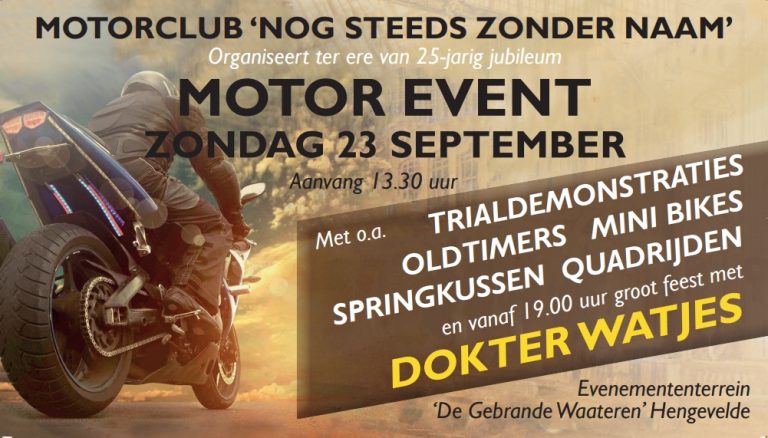 Vanaf 17:30 uur zal de alom bekende band 'Dokter Watjes' de scheuren in het plafond spelen en er een spectaculair jubileumfeest voor de motorclub 'Nog steeds zonder naam' van maken.
