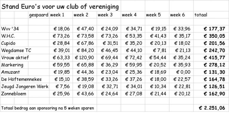 De dames van Vrouw Actief zijn inmiddels de grens van € 400,- gepasseerd en staan dan ook bovenaan, gevolgd door de handbalvereniging WHC, deze is ook heel goed bezig om hun verenigingskas te spekken. Amuzant en Jeugd Jongerenwerk sluiten de rij met het respectievelijk € 131.30 en € 126.51. De actie loopt nog t/m zaterdag 1 december. De kreet van de week "ga vol gas en koop bij de Spar, dan spaar je voor de clubkas." Voor de volledige stand kijk hieronder…