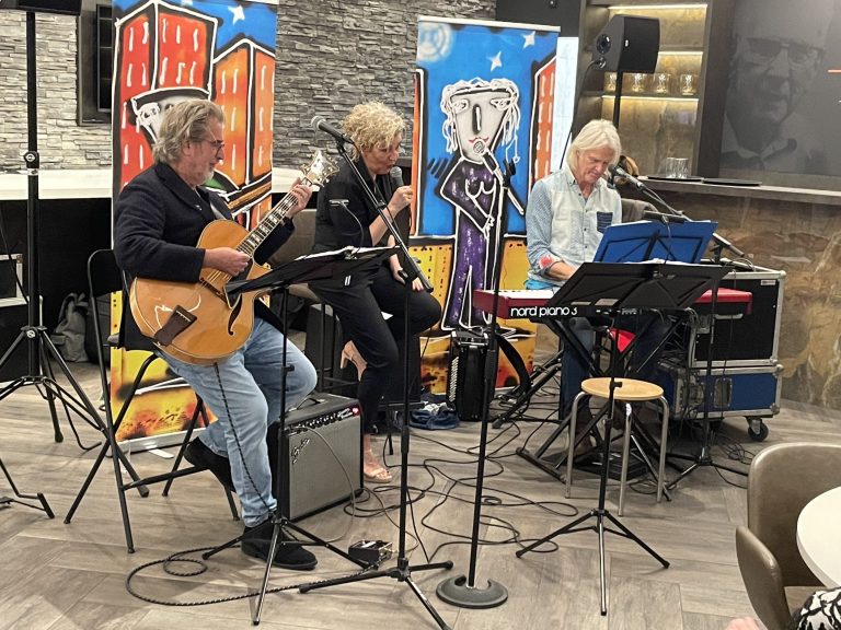 Het bestuur had het Trio 054 uit Enschede uitgenodigd om de avond verder te vullen met liedjes van Willem Wilmink en Harry Bannink. Duidelijk werd dat dit tweetal de Nederlandse muziek veel bekende nummers heeft opgeleverd. Ludiek was ook het moment dat voor een willekeurige dame uit de zaal een liefdeslied werd gezongen. In het refrein mocht ze zelf antwoorden met termen als ‘hènnig aan ‘n betje’. Een drankje en een paar heerlijke hapjes van de slager maakten de avond tot een succes.