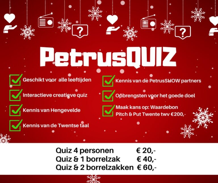 Om 20.30 start de PetrusQUIZ gepresenteerd door Arjan Assink. Een quiz voor alle leeftijden, dus voel je vooral niet te jong of te oud om mee te doen. De quiz gaat niet alleen over kennis, maar er wordt ook een beroep gedaan op je creativiteit. De kennis die je nodig hebt is niet te vinden op Google, maar wat dan wel… denk aan kennis van de Twentse taal, partners van de PetrusSHOW en Hengevelde natuurlijk. Bij een interactieve quiz horen ook hapjes, daarom hebben we ism Herberg de Gebrande Wateren borrelzakken (deze zijn bij opgave bij te bestellen) En dan natuurlijk de prijs niet te vergeten, ism Pitch & Put Twente een waardebon twv €200,- vrij te besteden. Heerlijk een dag samen (voet)golven, axe throwing of toch een escape room, onder het genot van een hapje en een drankje.