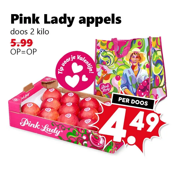 Pink Lady appels zijn er nu extra scherp geprijsd: een doos van 2 kilo voor €4,49 (op = op).