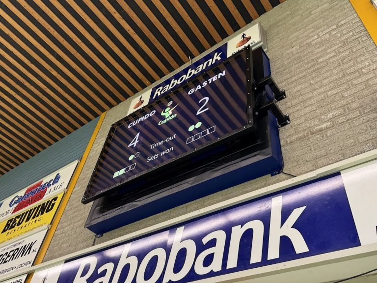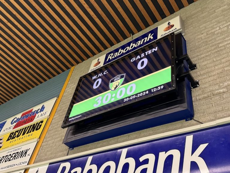Mark Tuinte: “We hebben afgelopen week een nieuw, multifunctioneel scorebord geplaatst. Dit bord kan niet alleen worden gebruikt om de score bij te houden tijdens sportwedstrijden, maar ook voor andere doeleinden. Zo zal het bijvoorbeeld ingezet kunnen worden voor video-gymlessen, tactische wedstrijdbesprekingen en/of een leuke filmavond voor de kinderen.” Het oude scorebord was aan het einde van zijn functionele levensduur. De afgelopen jaren waren er regelmatig technische storingen. Het nieuwe scorebord is een pilot/test waarbij weloverwogen een risico wordt genomen. De wensen van het bestuur van de SSGH en haar hoofdgebruikers in de Marke (WHC & Cupido) waren financieel ambitieus. Te ambitieus. Dus moest er gezocht worden naar een creatieve oplossing. In samenspraak met Mark ten Thije (TTM Techniek) en zijn neef Dennis ten Thije is een stabiele constructie ontwikkeld en gerealiseerd voor het 100” grote LCD-scherm. Ook een speciaal woord van dank inzake dit project voor Willem ten Thije (hulp bij de montage) en Ter Doest Beveiliging (beschikbaar stellen hoogwerker). De komende weken zal blijken of de pilot positief uitpakt. Vooral de ervaringen van de gebruikers zal hierin doorslaggevend zijn. De eerste geluiden zijn positief. Afgelopen week is het LCD-scherm in gebruik genomen door WHC.