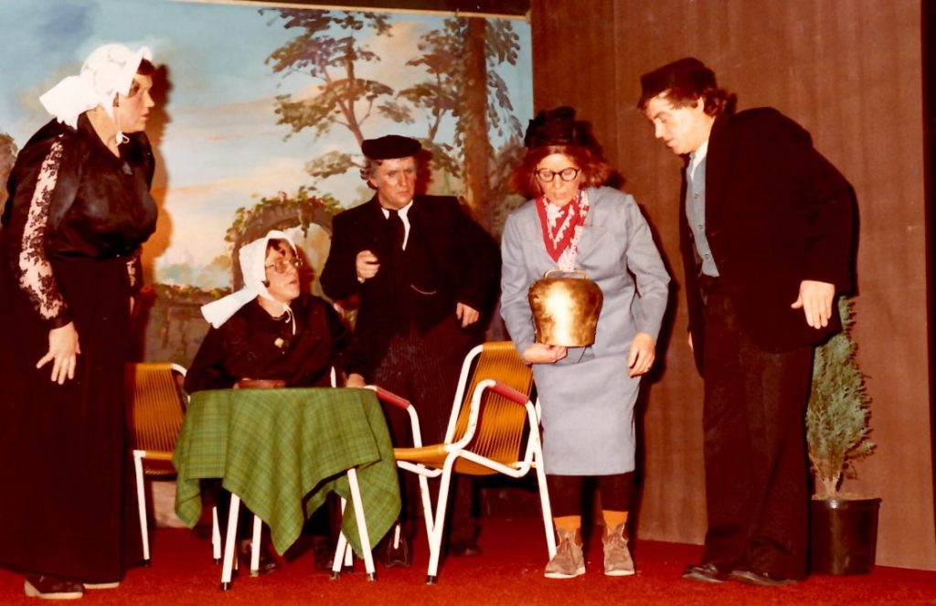 “Ik was Betske met zijn bretels, een boeren knecht met een veel te grote broek aan Ik deed van alles wat eigenlijk niet mocht. Het was een beetje als de Wierdense Revue, de pastoor en de burgemeester waren uitgenodigd en zaten uiteraard op de eerste rij! Ik was bladveger op het podium en veegde de bladeren over de hoge heren heen.