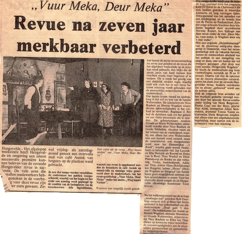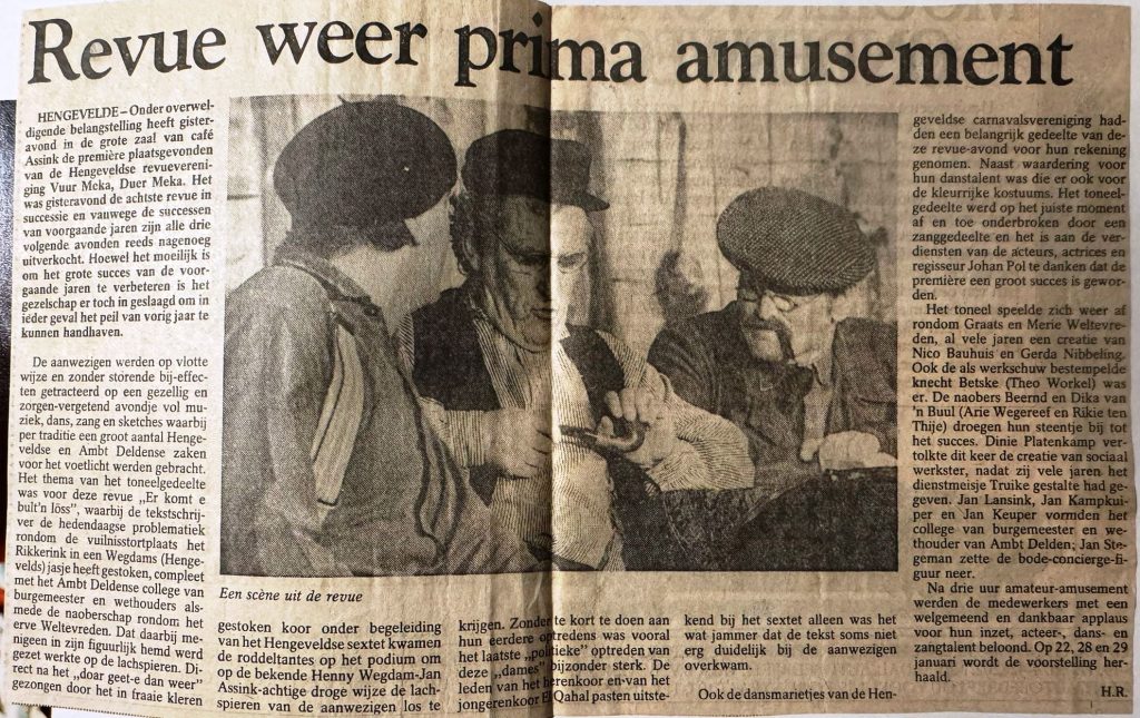 “Ik heb toch doorgezet, ik heb de teksten geschreven, de muziek en de mensen geregeld en de rollen verdeeld. De eerste Revue had de muziek van de band Chafronita’s, (Charlottte Wegdam-Fronica en Anita Eijsink) met o.a. Charlotte Wegdam en onze toneelgroep bestond uit Jan Assink, Dinie Platenkamp, Minie Pelle, Hennie (alias Macky), en ikzelf. Later was het samen schrijven met Macky wat de teksten betreft. Met een pak aan Deldense Weekbladen onder de arm en veel parate kennis over het afgelopen jaar gingen we aan de slag”